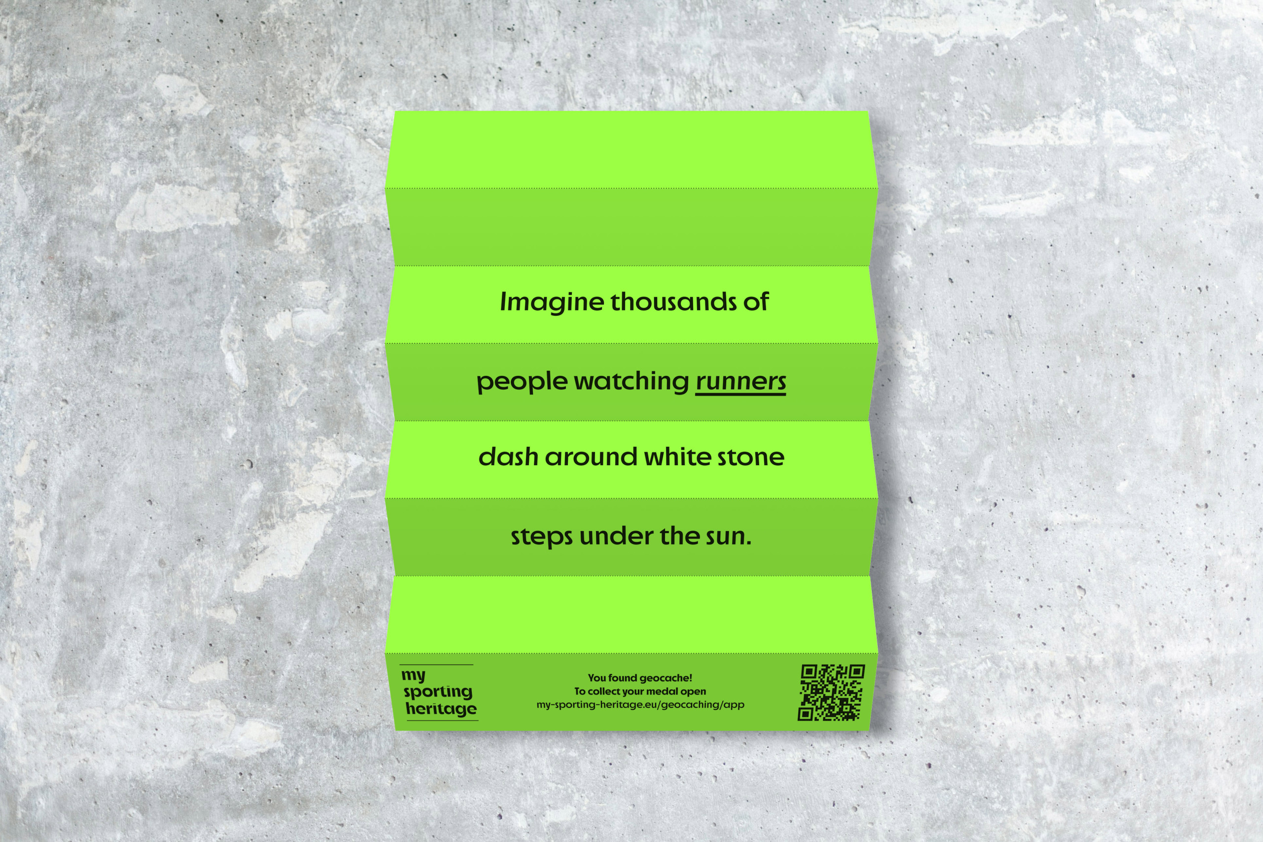 A physical-digital geocaching game where players explore a space to find hidden “caches”. Each cache unlocks a digital medal featuring a short story, a fun fact, and a simple physical challenge — all tied to historical sporting venues.